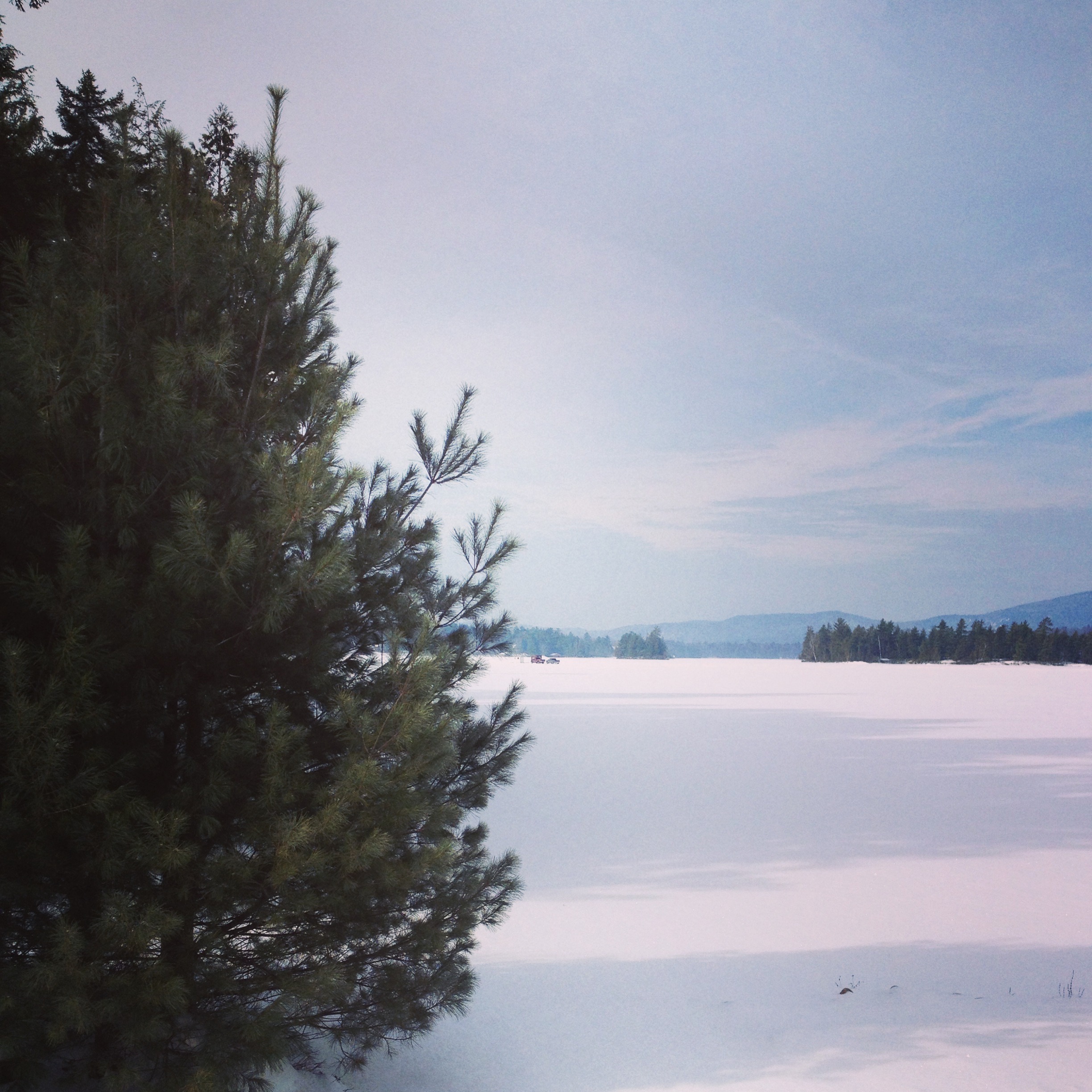 Some of the nets had tents sitting above the holes and lines wading into the depths of the water. Two dark figures walked briskly across the ice a mile away, two little dots on the horizon below the skyscraping mountains prodigious against the clouds. They stood there, lofted and imposing, dominating the scene ahead of me, the faces peppered with pines and little shelves of desolate white bareness, vacant white trails forsaken of life, barren but of what I knew even from this distance to be snowmobile trails currently lacking in movement.